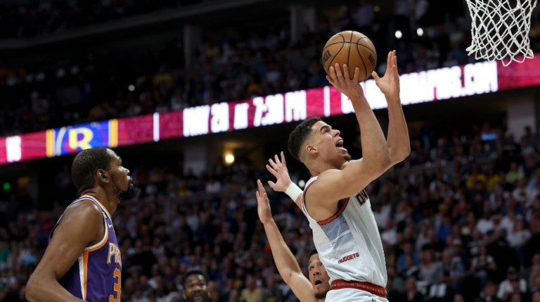 小迈克尔·波特在菲尼克斯太阳队的两名后卫面前完成了一次疯狂的上篮
